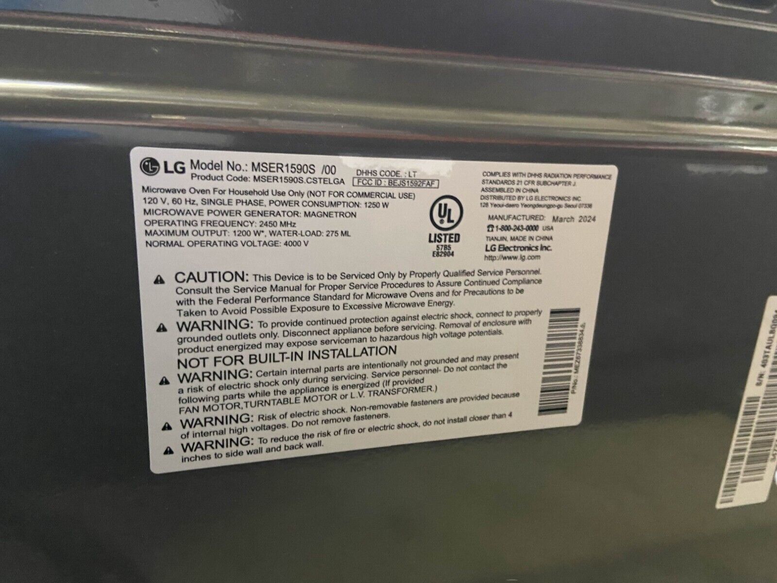 LG Microwaves MSER1590S 1.5 Cu.ftSmart Inverter Anti-bacteria 1200 Watt